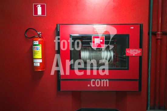2862345 Sistema de combate a incêndios em estação do Metrô de São Paulo. Mangueira, brigada. Na foto, hidrante e extintor de incêndio.