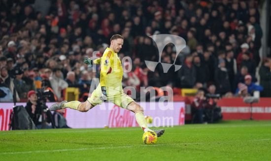 2869402 Matz Sels, do Nottingham Forest, afasta a bola durante a partida da Premier League entre Nottingham Forest e Arsenal, no City Ground, em Nottingham. (Paul Bonser/Sports Press Photo / SPP)