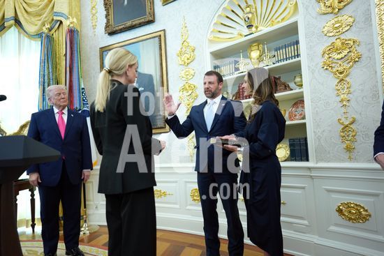 ny240326153511 As President Donald Trump looks on at left, Secretary of Homeland Security Markwayne Mullin is sworn in by Attorney General Pam Bondi in the Oval Office on Tuesday, March 24, 2026. Christine Mullin, MullinÕs wife, holds the Bible. (Doug Mills/The New York Times/Fotoarena)