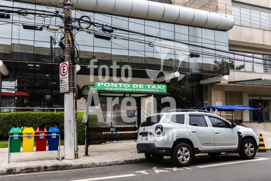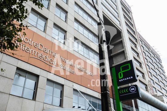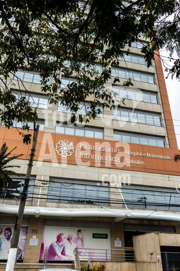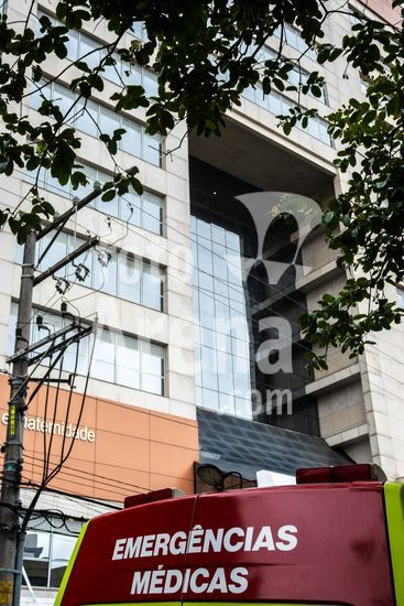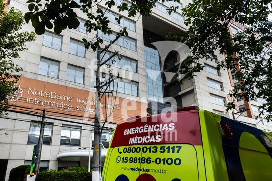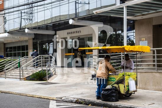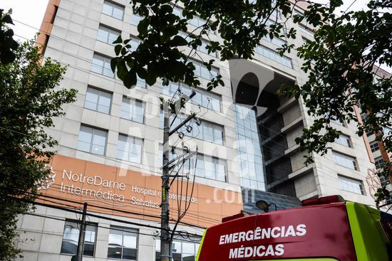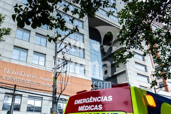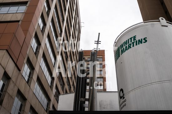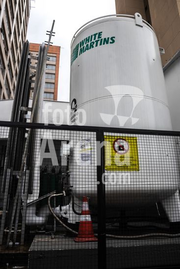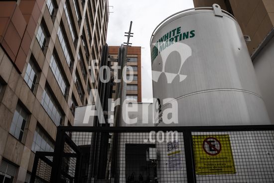 Tanque de armazenamento de oxigênio líquido da empresa White Martins, localizado na área externa do Hospital Salvalus, na zona leste da cidade de São Paulo, Brasil. Este tipo de reservatório criogênico é fundamental para a infraestrutura hospitalar, garantindo o fornecimento contínuo de oxigênio medicinal, um gás vital para o tratamento de pacientes com insuficiência respiratória, em procedimentos cirúrgicos e em unidades de terapia intensiva (UTI). A imagem ilustra a interseção entre a tecnologia industrial e a prestação de cuidados de saúde em um grande centro urbano, destacando a logística necessária para manter o suporte à vida em unidades de saúde