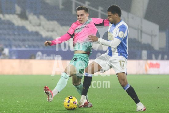 2881814 George Broadbent (8 Doncaster Rovers) disputa a bola com Marcus McGuane (17 Huddersfield Town) durante a partida das quartas de final do EFL Vertu Trophy entre Huddersfield Town e Doncaster Rovers no Accu Stadium em Huddersfield, Inglaterra, em 10 de fevereiro de 2026. (Sean Chandler / SPP)