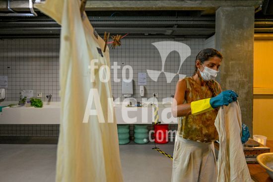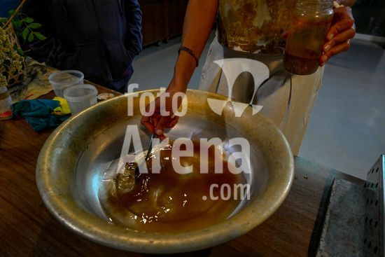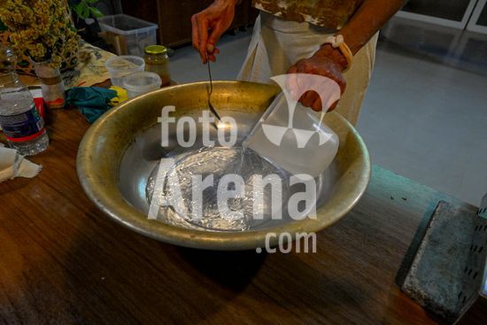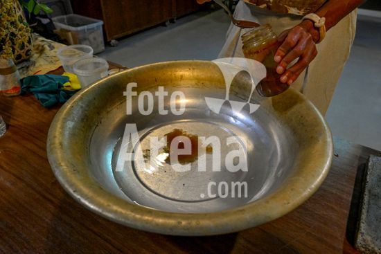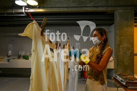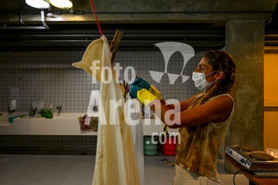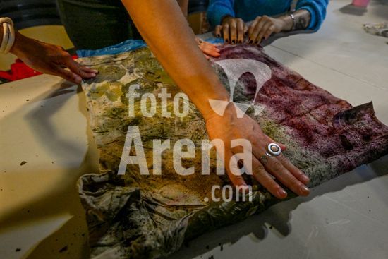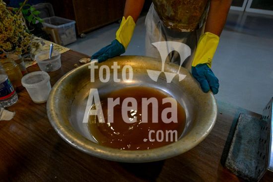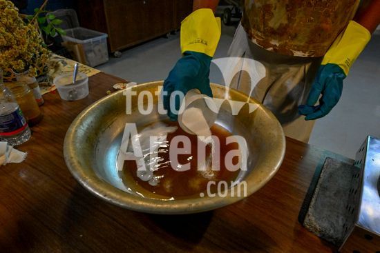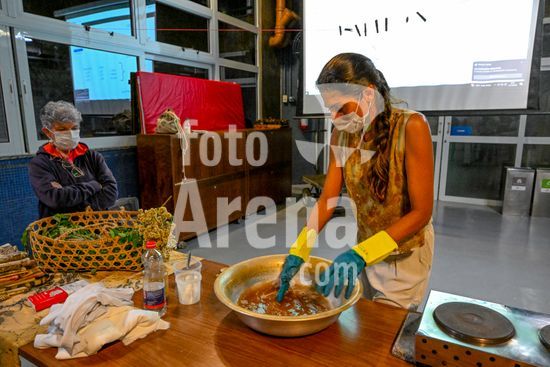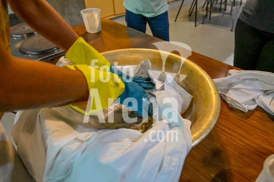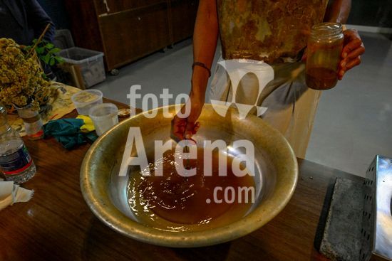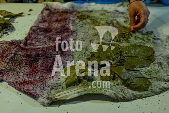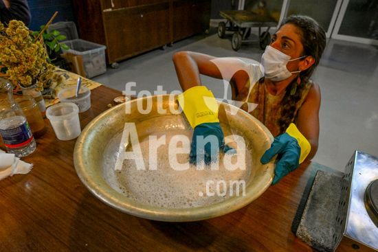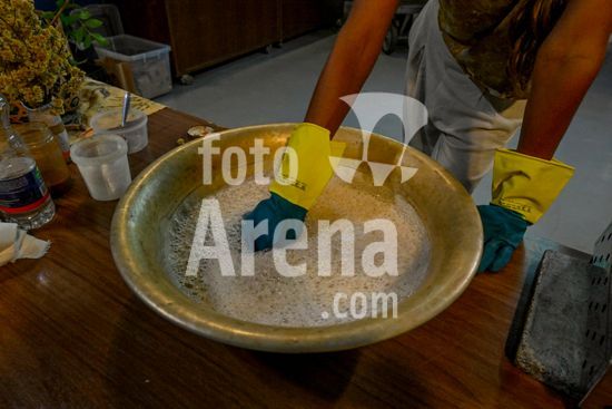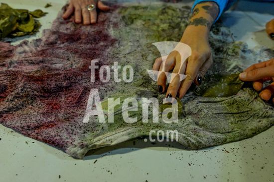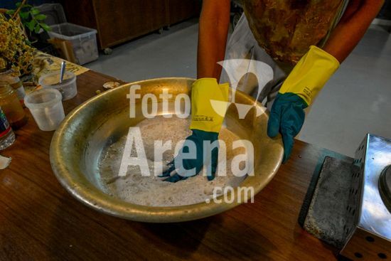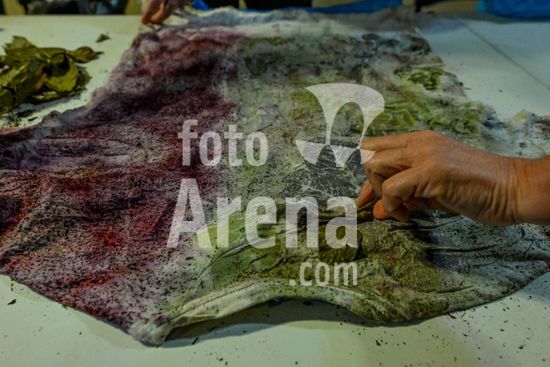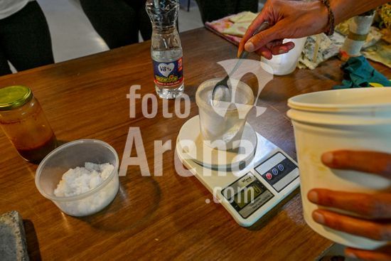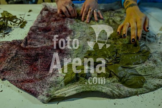 Segundo dia do curso de Impressão Botanica com a artesão Raquel Toledo Cartaxo onde foi ensinado a parte de mordentação , que é a parte de preparo dos tecidos para receber a impressão botanica envolve medidas e pesagens de produtos quimicos volateis de baixa toxidade , mas aconselhavel o uso de mascara .