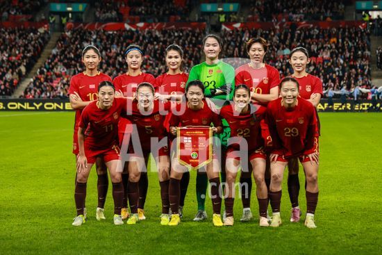 2850261 O goleiro Hongyan Pan (23 China), Jiaxing Dou (3 China), Linlin Wang (4 China), Haiyan Wu (5 China), Wei Yao (8 China), Yanwen Wang (10 China), Mengwen Li (11 China), Ziqin Shao (20 China), Qiaozhu Chen (22 China), Aifang Wang (24 China), Gumula Wuri (29 China) tiram uma foto de grupo durante o amistoso internacional entre Inglaterra e China no Estadio de Wembley, em Londres, Inglaterra. (Leiting Gao / SPP)