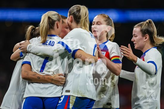 2850262 Georgia Stanway (8 Inglaterra) comemora apos marcar o quinto gol de sua equipe com Beth Mead (7 Inglaterra), Keira Walsh (4 Inglaterra), Lauren Hemp (11 Inglaterra) e Alessia Russo (9 Inglaterra) durante o amistoso internacional entre Inglaterra e China no Estadio de Wembley em Londres, Inglaterra. (Leiting Gao / SPP)