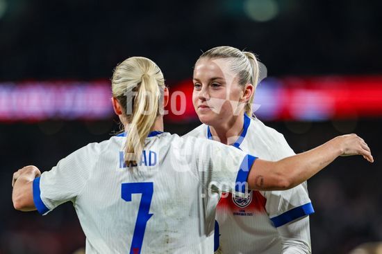 2850269 Beth Mead (7 Inglaterra) comemora apos marcar o segundo gol de sua equipe com Alessia Russo (9 Inglaterra) durante o amistoso internacional entre Inglaterra e China no Estadio de Wembley em Londres, Inglaterra. (Leiting Gao / SPP)