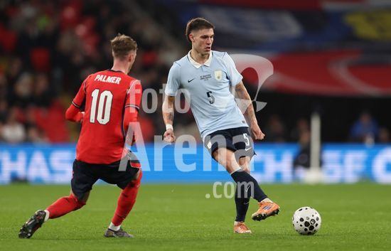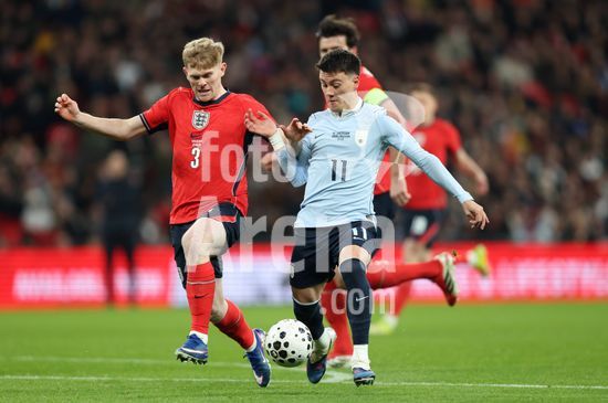 2913253 LONDRES, INGLATERRA, 27 DE MARCO: Lewis Hall, da Selecao Inglesa, disputa a bola com Facundo Pellistri, da Selecao Uruguaia, durante a partida amistosa internacional entre Inglaterra e Uruguai, no Estadio de Wembley, em Londres, Inglaterra, em 27 de marco. (Foto de Daniel Weir) (Daniel Weir/Sports Press Photo / SPP)