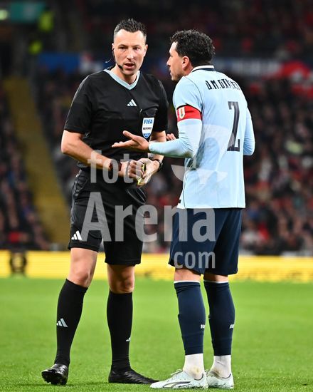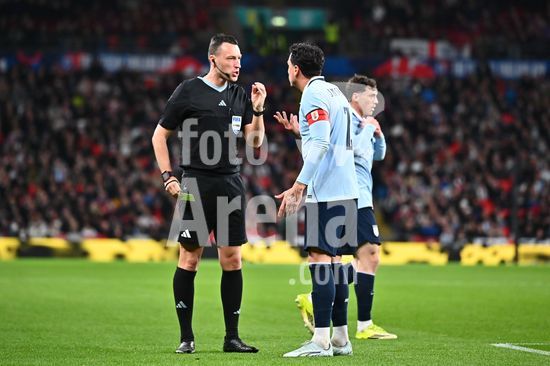 2913282 LONDRES, INGLATERRA - 27 DE MARCO: Jose Maria Gimenez, do Uruguai, conversa com o arbitro Sven Jablonski durante o amistoso internacional entre Inglaterra e Uruguai no Estadio de Wembley, em 27 de marco de 2026, em Londres, Inglaterra. (Yaroslav Dunka / SPP)