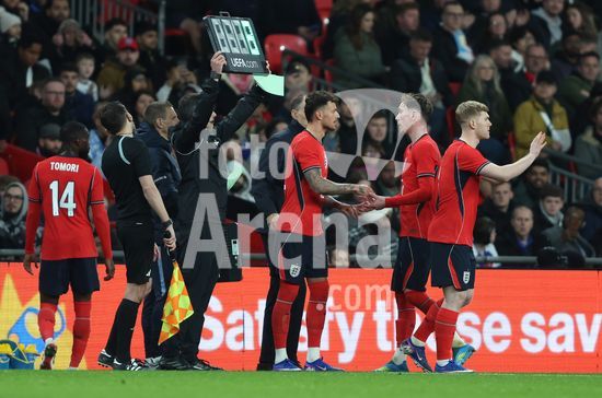 2913278 LONDRES, INGLATERRA, 27 DE MARCO: Ben White, da Selecao Inglesa, entra em campo no lugar de James Garner, tambem da Selecao Inglesa, durante a partida amistosa internacional entre Inglaterra e Uruguai, no Estadio de Wembley, em Londres, Inglaterra, em 27 de marco. (Foto de Daniel Weir) (Daniel Weir/Sports Press Photo / SPP)