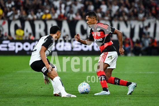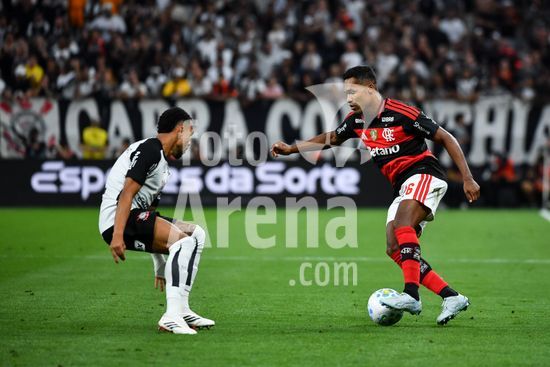 2910243 Matheuzinho do Corinthians e Alex Sandro do Flamengo disputam a bola, durante partida entre Corinthians x Flamengo, válida pela oitava rodada do Campeonato Brasileiro de Futebol 2026, neste domingo (22), na Neo Química Arena, SP.