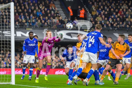 2897047 IPSWICH, INGLATERRA - 3 de marco: Christian Walton, do Ipswich Town, soca a bola apos um escanteio durante a partida do Sky Bet Championship entre Ipswich Town e Hull City, no Portman Road, em 3 de marco de 2026, em Ipswich, Inglaterra. (Keeran Marquis/SPP)