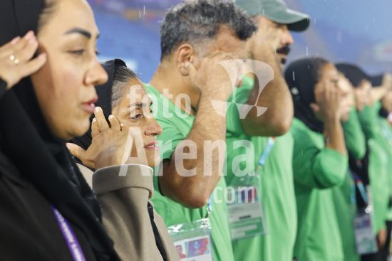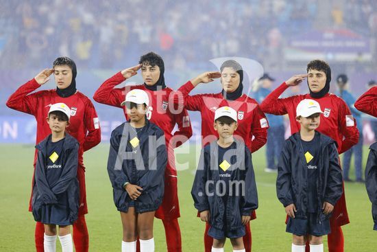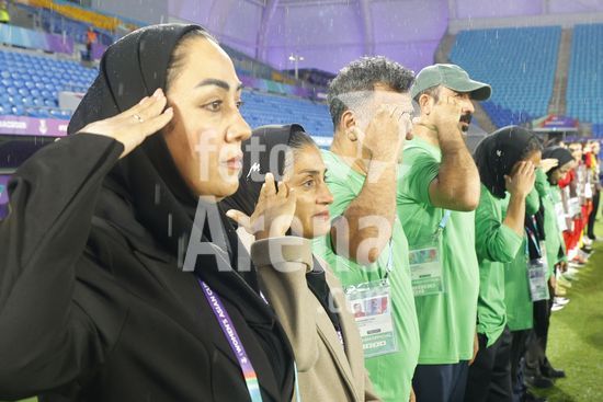 2900589 GOLD COAST, AUSTRALIA - 8 DE MARCO Marziyeh Jafari (tecnica da selecao iraniana - segunda da esquerda para a direita) presta continencia ao hino nacional antes da partida da Copa Asiatica Feminina entre a Republica Islamica do Ira e as Filipinas, no Estadio Gold Coast, em 8 de marco de 2026, em Gold Coast, Australia. (Matthew Starling / SPP)