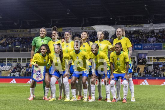 2832034 Titulos do Seleçao Brasileira posar para foto antes amistoso da Seleção Brasileira Feminina contra a Seleção da Italia realizado no Estádio Ennio Tardini, em Parma Italia, nesta terça-feira, 28. (Will Anacleto/Sports Press Photo)