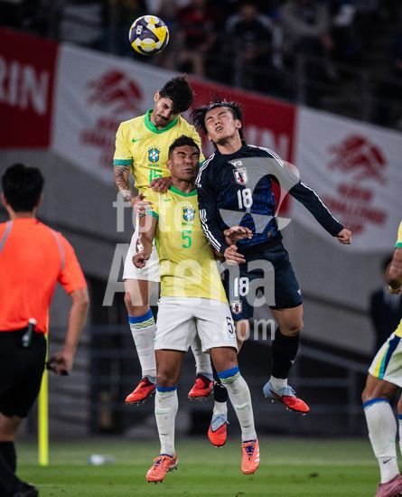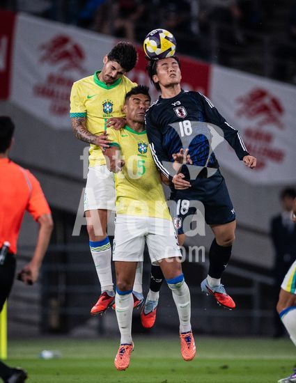 2823699 Casemiro e Lucas Beraldo do Brasil disputam a posse de bola com Ayase Ueda do Japão durante o jogo amistoso entre Japão e Brasil no Estádio Ajinomoto em Tóquio, Japão. (Ricardo Nogueira/SPP)