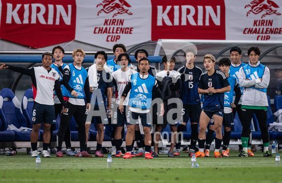 2823682 Reservas do Japão Assistem ao jogo nervosamente enquanto vencem nos minutos finais durante o jogo amistoso entre Japão e Brasil no Estádio Ajinomoto em Tóquio, Japão. (Ricardo Nogueira/SPP)