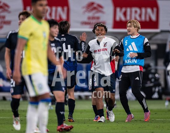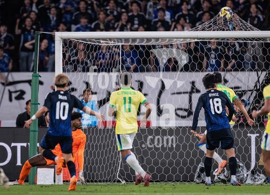 2823700 Ayase Ueda marca terceiro gol do Japão durante o jogo amistoso entre Japão e Brasil no Estádio Ajinomoto em Tóquio, Japão. (Ricardo Nogueira/SPP)