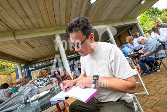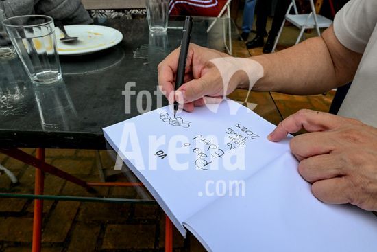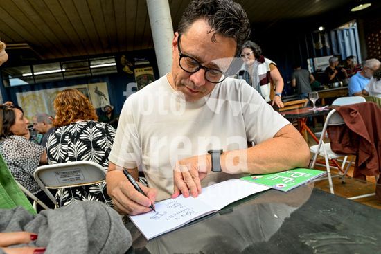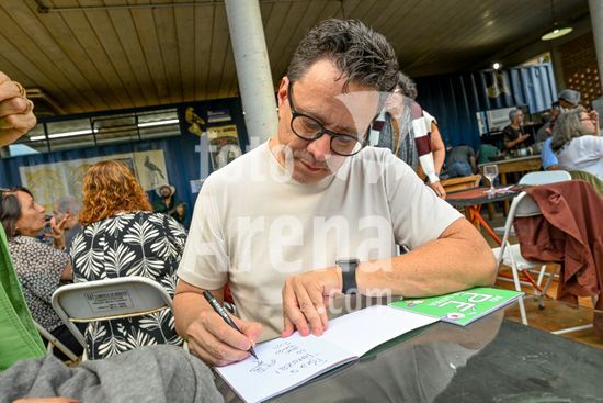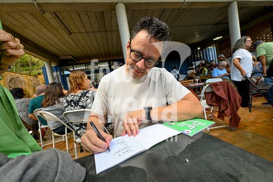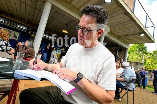 2838501 O chargista Jean Galvão assina diversos livros de sua autoria durante o lançamento e abertura de sua exposição no Atelier De Etser .