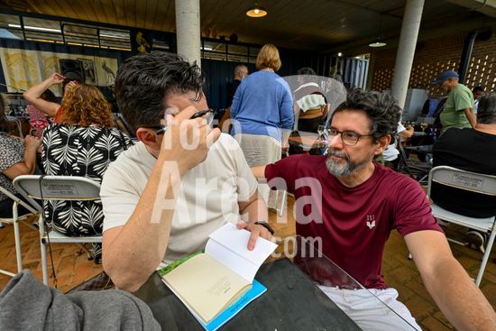 2838495 O chargista Jean Galvão assina diversos livros de sua autoria durante o lançamento e abertura de sua exposição no Atelier De Etser .