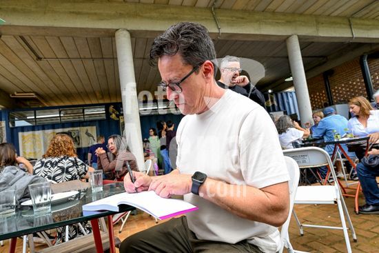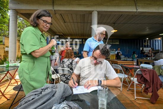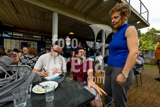 2838496 O chargista Jean Galvão assina diversos livros de sua autoria durante o lançamento e abertura de sua exposição no Atelier De Etser .