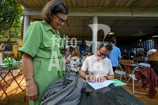2838500 O chargista Jean Galvão assina diversos livros de sua autoria durante o lançamento e abertura de sua exposição no Atelier De Etser .