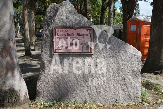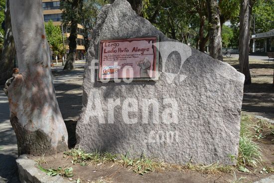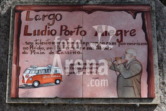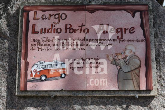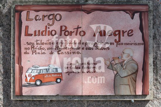 Imagens de placa de cerâmica em homenagem ao publicitário Ludio Porto Alegre, por seu pioneirismo no rádio, na publicidade e nos shows na praia do Cassino; placa instalada em uma pedra localizada no canteiro central, em local denominado Largo Ludio Porto Alegre, na Avenida Rio Grande, na praia do Cassino, no Município de Rio Grande. Rio Grande, RS (07).