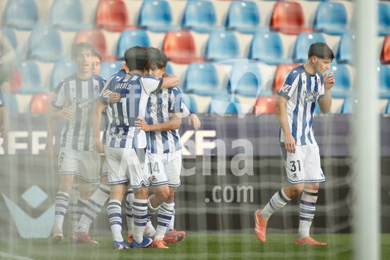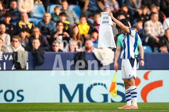 2861213 Takefusa Kubo comemora o primeiro gol durante Levante x Real Sociedad realizada no Estadio Ciutat de Valencia em valência, CV.
