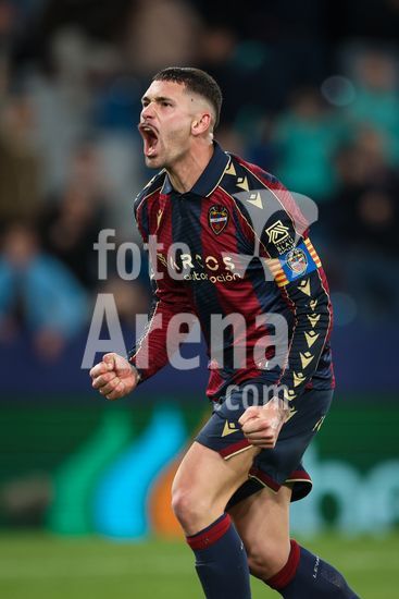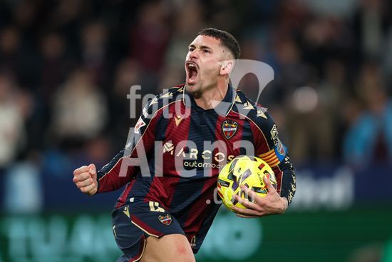 2861257 Adrián De la Fuente comemora o primeiro gol durante Levante x Real Sociedad realizada no Estadio Ciutat de Valencia em valência, CV.