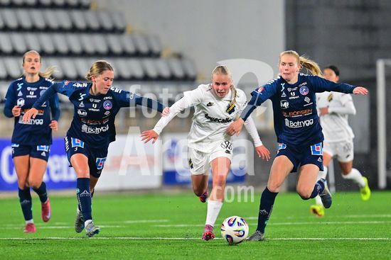 2825816 Polly Duran (3 Linkoping FC), Nova Selin (18 AIK) e Malin Johnsen Brehn (16 Linkoping FC) em uma batalha pela bola durante o jogo da Liga Sueca OBOS Damallsvenskan em 17 de outubro de 2025 entre Linkoping FC e AIK na Bilborsen Arena em Linkoping, Suecia (Peter Sonander/SPP)