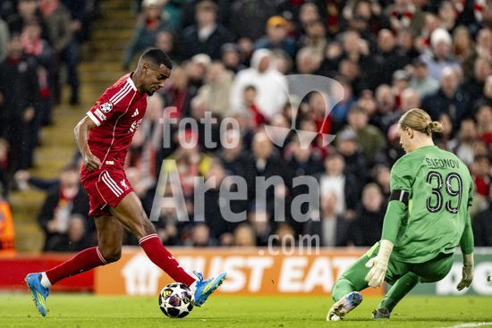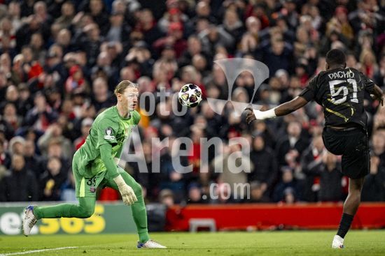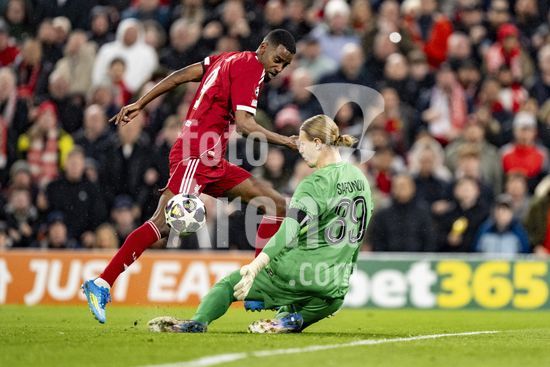 2924650 LIVERPOOL, INGLATERRA - 14 DE ABRIL: Alexander Isak, do Liverpool, e Matvey Safonov, do Paris Saint-Germain, em acao durante uma partida da Liga dos Campeoes da UEFA 2025/26 entre Liverpool e Paris Saint-Germain, em Liverpool, em 14 de abril de 2026. (Will Palmer/SPP)