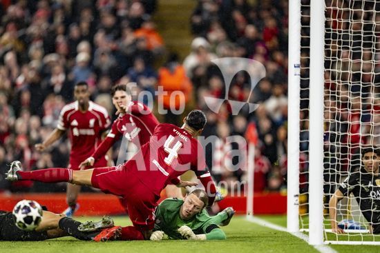 2924654 LIVERPOOL, INGLATERRA - 14 DE ABRIL: Matvey Safonov, do Paris Saint-Germain, faz uma defesa em chute de Virgil van Dijk, do Liverpool, durante partida da Liga dos Campeoes da UEFA 2025/26 entre Liverpool e Paris Saint-Germain, em Liverpool, em 14 de abril de 2026. (Will Palmer/SPP)