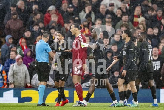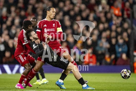 2924648 LIVERPOOL, INGLATERRA - 14 DE ABRIL: Jeremie Frimpong e Virgil van Dijk, do Liverpool, disputam a posse de bola com Khvicha Kvaratskhelia, do Paris Saint-Germain, durante uma partida da Liga dos Campeoes da UEFA 2025/26 entre Liverpool e Paris Saint-Germain, em Liverpool, em 14 de abril de 2026. (Will Palmer/SPP)
