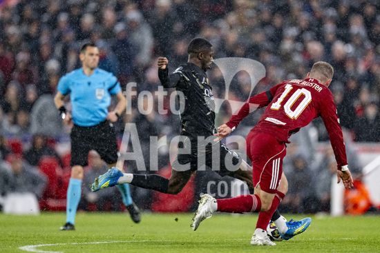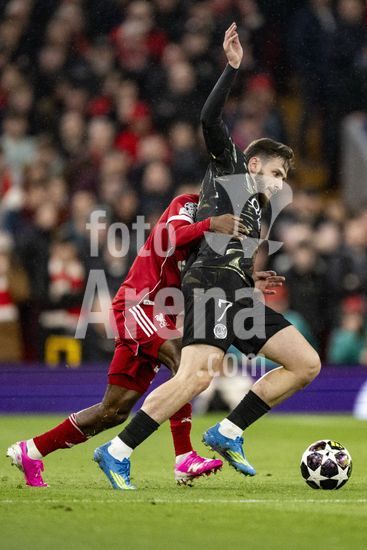2924651 LIVERPOOL, INGLATERRA - 14 DE ABRIL: Jeremie Frimpong, do Liverpool, e Khvicha Kvaratskhelia, do Paris Saint-Germain, disputam a posse de bola durante uma partida da Liga dos Campeoes da UEFA 2025/26 entre Liverpool e Paris Saint-Germain, em Liverpool, em 14 de abril de 2026. (Will Palmer/SPP)