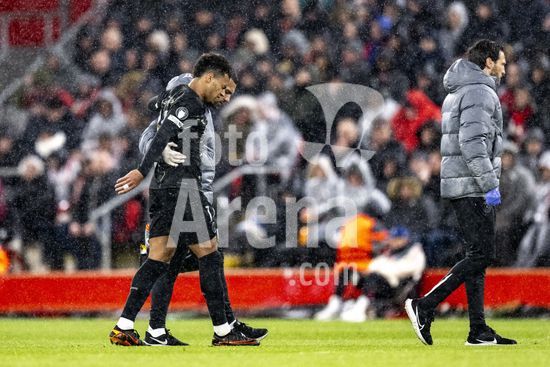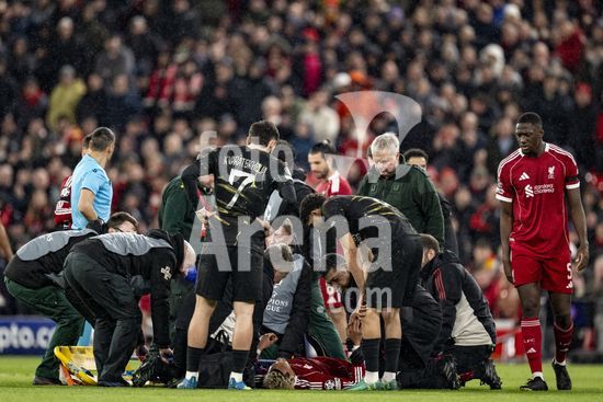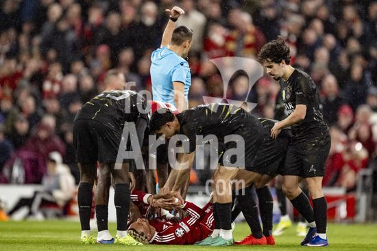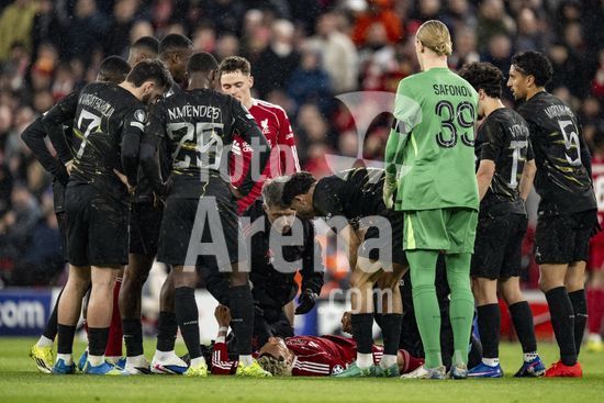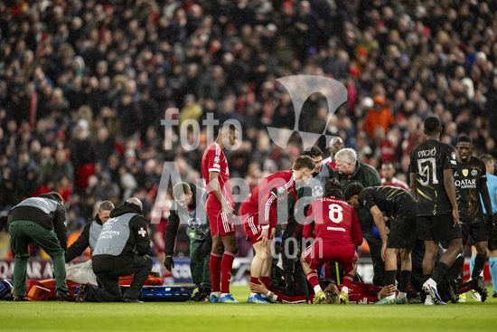 2924655 LIVERPOOL, INGLATERRA - 14 DE ABRIL: Hugo Ekitike, do Liverpool, lesionado durante uma partida da Liga dos Campeoes da UEFA 2025/26 entre Liverpool e Paris Saint-Germain, em Liverpool, em 14 de abril de 2026. (Will Palmer/SPP)