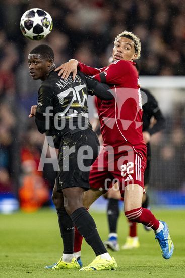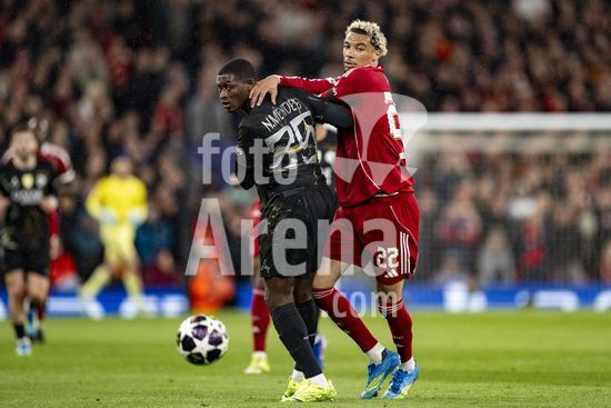 2924674 LIVERPOOL, INGLATERRA - 14 DE ABRIL: Hugo Ekitike, do Liverpool, e Nuno Mendes, do Paris Saint-Germain, disputam a posse de bola durante a partida da Liga dos Campeoes da UEFA 2025/26 entre Liverpool e Paris Saint-Germain, em Liverpool, em 14 de abril de 2026. (Will Palmer/SPP)
