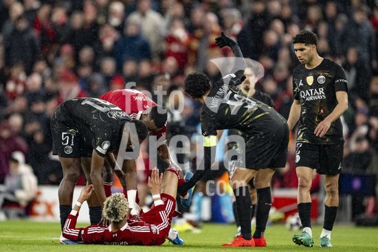 2924671 LIVERPOOL, INGLATERRA - 14 DE ABRIL: Hugo Ekitike, do Liverpool, lesionado durante uma partida da Liga dos Campeoes da UEFA 2025/26 entre Liverpool e Paris Saint-Germain, em Liverpool, em 14 de abril de 2026. (Will Palmer/SPP)