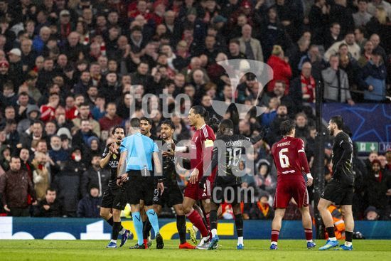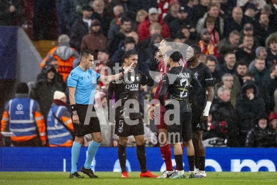 2924786 LIVERPOOL, INGLATERRA - 14 DE ABRIL: Jogadores do PSG reclamam com o arbitro Maurizio Mariani durante uma partida da Liga dos Campeoes da UEFA 2025/26 entre Liverpool e Paris Saint-Germain em Liverpool, em 14 de abril de 2026. (Will Palmer/SPP)
