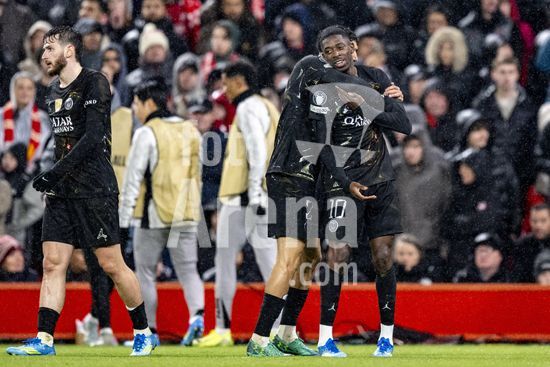 2924976 LIVERPOOL, INGLATERRA - 14 DE ABRIL: Jogadores do PSG comemoram diante da torcida apos a vitoria sobre o Paris Saint-Germain pela Liga dos Campeoes da UEFA 2025/26, em Liverpool, no dia 14 de abril de 2026. (Will Palmer/SPP)
