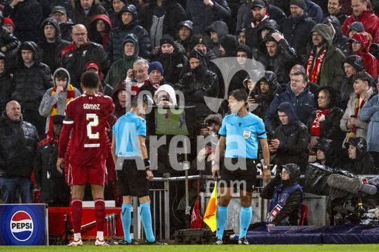 2924798 LIVERPOOL, INGLATERRA - 14 DE ABRIL: O arbitro Maurizio Mariani consulta o VAR durante a partida da Liga dos Campeoes da UEFA 2025/26 entre Liverpool e Paris Saint-Germain, em Liverpool, em 14 de abril de 2026. (Will Palmer/SPP)