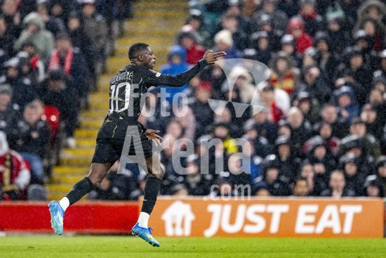 2924791 LIVERPOOL, INGLATERRA - 14 DE ABRIL: Ousmane Dembele, do Paris Saint-Germain, marca o primeiro gol da equipe durante a partida da Liga dos Campeoes da UEFA 2025/26 entre Liverpool e Paris Saint-Germain, em Liverpool, em 14 de abril de 2026. (Will Palmer/SPP)