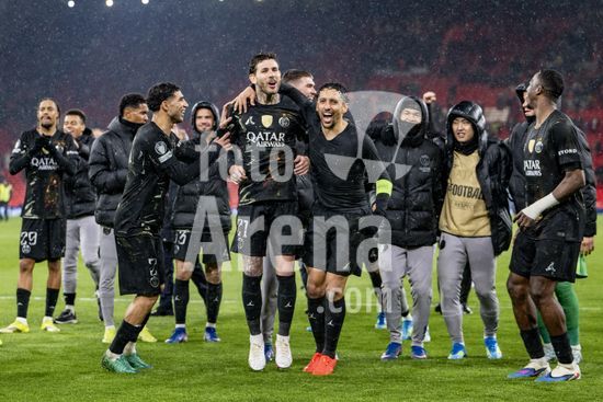 2924974 LIVERPOOL, INGLATERRA - 14 DE ABRIL: Marquinhos, do Paris Saint-Germain, e jogadores do PSG comemoram em frente a torcida apos a vitoria sobre o Paris Saint-Germain pela Liga dos Campeoes da UEFA 2025/26, em Liverpool, no dia 14 de abril de 2026. (Will Palmer/SPP)