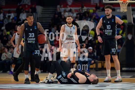 2882533 Karolis Lukosiunas (16 London Lions) caido lesionado durante o jogo da BKT EuroCup entre London Lions e Lietkabelis Panev?zys na Copper Box Arena em Londres, Inglaterra. (Foto de Keeran Marquis/Sports Press Photo/SPP) (Keeran Marquis/SPP)