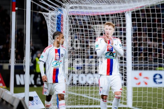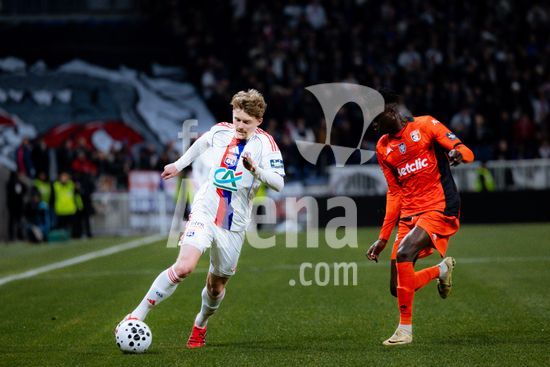 2879507 Adam Karabec do Olympique Lyonnais e Noah Nartey do Olympique Lyonnais em acao durante as oitavas de final do jogo Coupe de France entre Olympique Lyonnais e Stade lavallois Mayenne Football Club no Groupama Stadium em Lyon, Franca. (Pauline FIGUET / SPP)