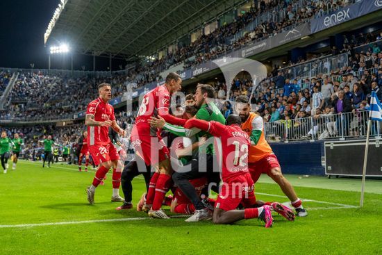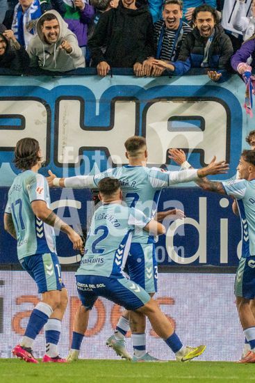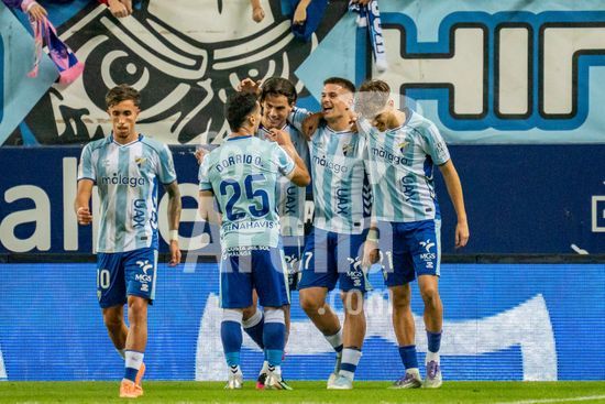 2838844 Rafa Rodriguez (N37) comemora um gol com Eneko Jauregui (N17) e Adrian Nino (N21) durante a partida La Liga Hypermotion entre Malaga CF e Cordoba CF no Estadio de la Rosaleda em Malaga, Espanha (Andres Lopez Sheridan / SPP)