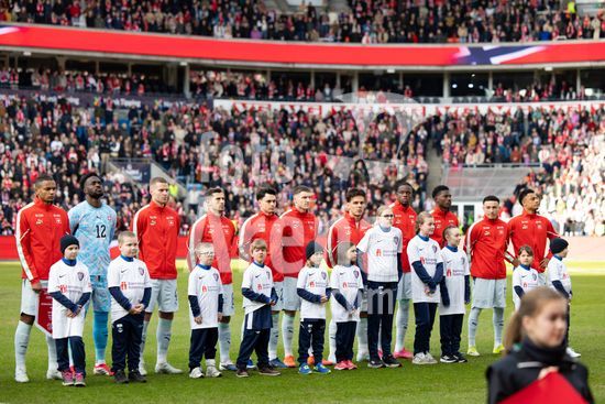 2915782 OSLO, NORUEGA - 31 DE MARCO: Jogadores e membros da comissao tecnica da Noruega cantam o hino nacional antes do amistoso internacional entre Noruega e Suica no Estadio Ullevaal, em 31 de marco de 2026, em Oslo, Noruega. (Ane Frosaker/SPP)