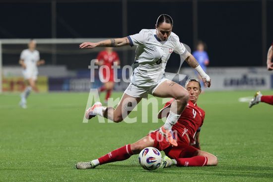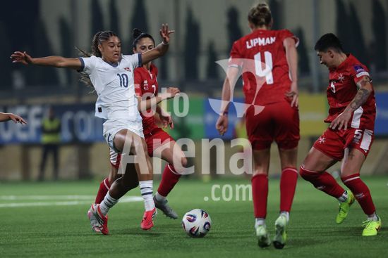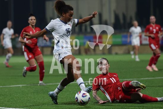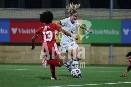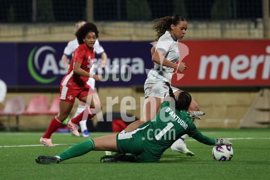 2902888 07.03.2026; Ta' Qali, Fussball - Qualificacao Europeia Feminina da UEFA - Malta vs Schweiz: Maya Lucia (MLT) - Aurelie Csillag (SUI) (Domenic Aquilina / SPP)