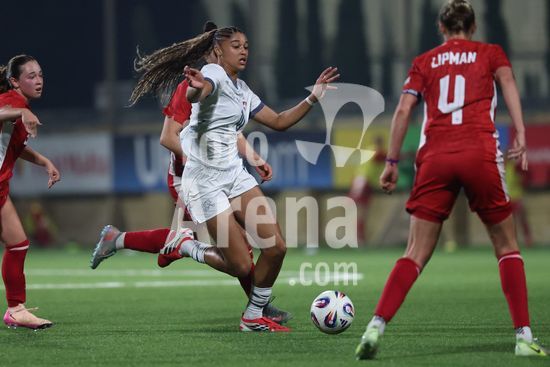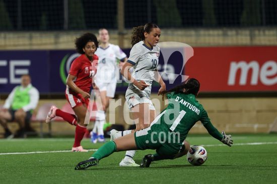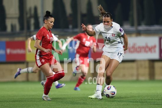2902890 07.03.2026; Ta' Qali, Fussball - Qualificacao Europeia Feminina da UEFA - Malta vs Schweiz: Sydney Schertenleib (SUI) - Emma Lipman (MLT) (Domenic Aquilina / SPP)
