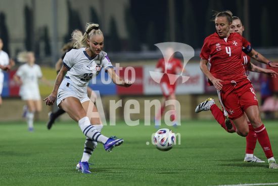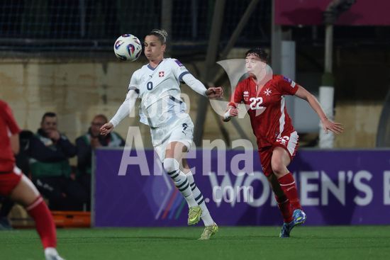 2902887 07.03.2026; Ta' Qali, Fussball - Qualificacao Europeia Feminina da UEFA - Malta vs Schweiz: Ana-Maria Crnogorcevic (SUI) - Jade Flask (MLT) (Domenic Aquilina / SPP)