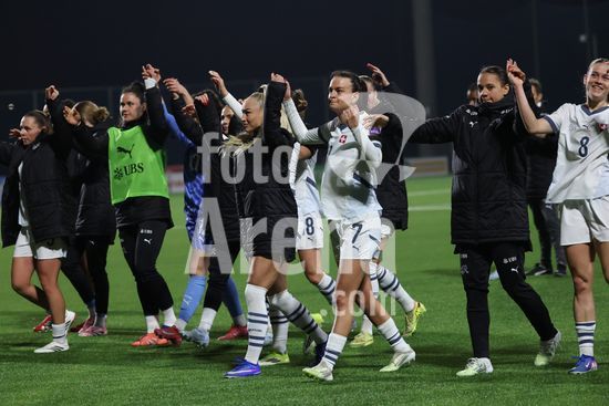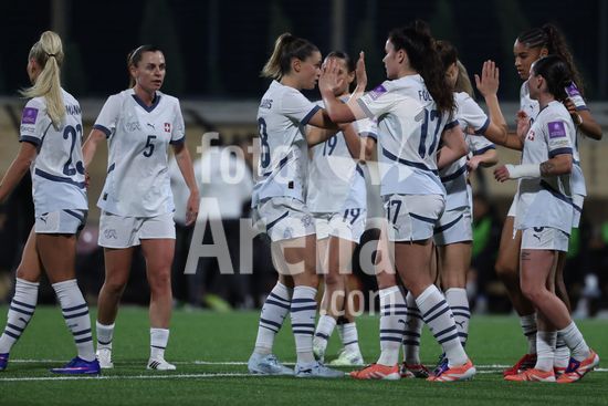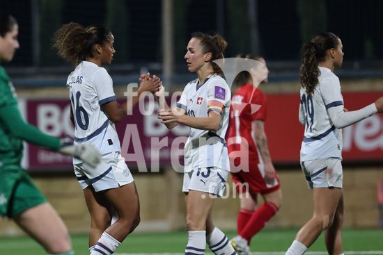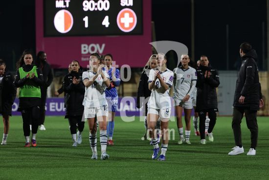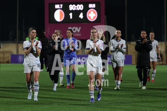 2902912 07.03.2026; Ta' Qali, Futebol - Eliminatorias Europeias Femininas da UEFA - Malta x Suica: Jogadoras suicas comemoram apos o apito final. (Domenic Aquilina / SPP)