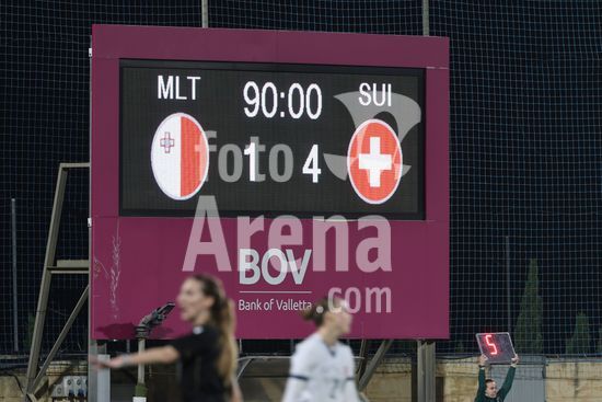 2902899 07.03.2026; Ta' Qali, Futebol - Eliminatorias Europeias Femininas da UEFA - Malta x Suica: Placar da partida apos 90 minutos. (Domenic Aquilina / SPP)