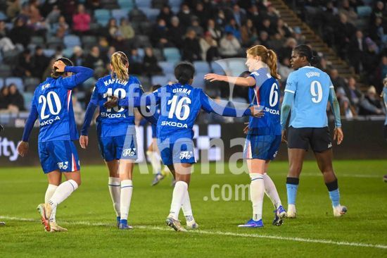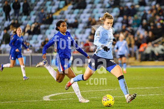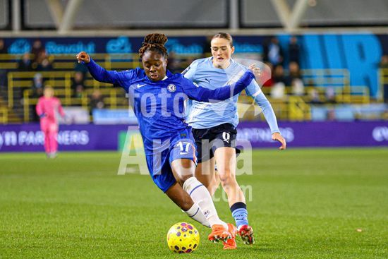 2871550 Khadija Bunny Shaw (9 Manchester City) com a bola durante a partida semifinal da Copa da Liga Feminina Subway entre Manchester City e Chelsea no Estadio Joie em Manchester, Inglaterra. (Natalie Mincher/SPP)