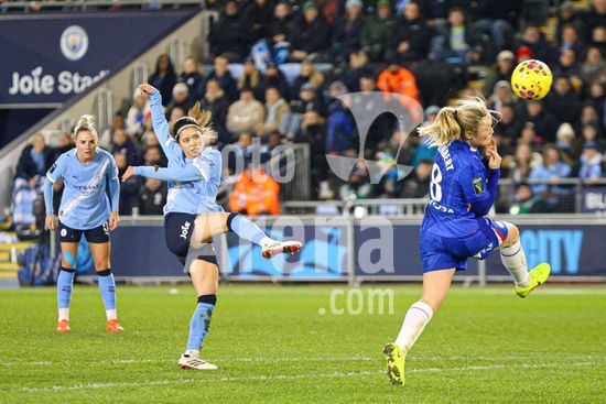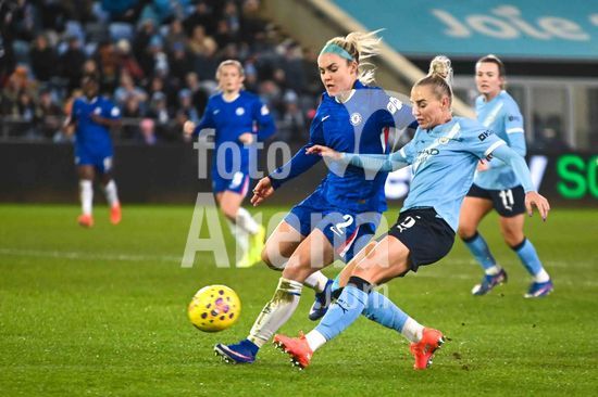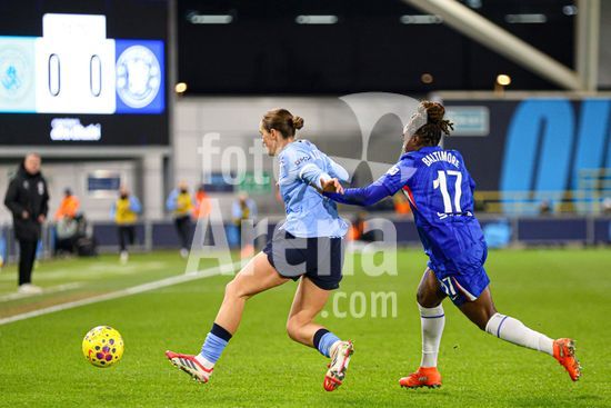 2871626 Khadija Bunny Shaw (9 Manchester City) e Naomi Girma (16 Chelsea) disputam a bola durante a partida semifinal da Copa da Liga Feminina Subway entre Manchester City e Chelsea no Estadio Joie em Manchester, Inglaterra. (Natalie Mincher/SPP)